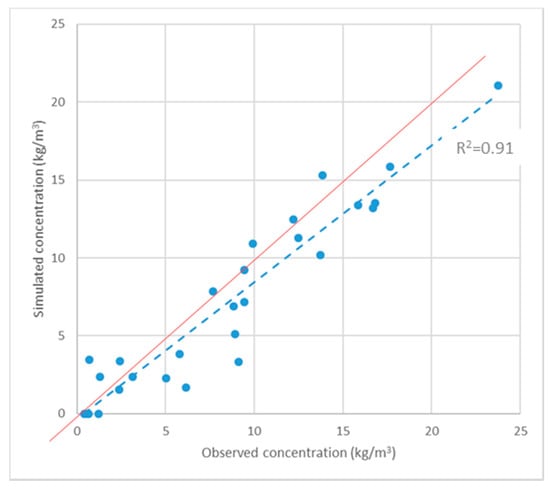 Figure 10 and Figure 11 and Table 5 report concentration results for model n.1 (Figure S8): the simulated concentration values are similar to the measured ones during the survey of November 2009, with an absolute concentration mean of residuals equal to 1.87 kg/m3, corresponding to a 5% error (i.e., standardized RMSE).