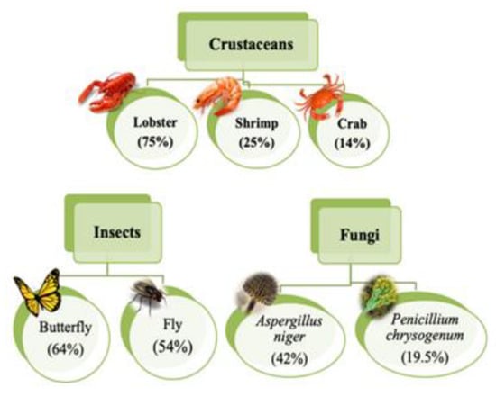 Chitosan can be prepared from chitin (aminopolysaccharide polymer). Chitin occurs in nature (skeletons of crab, shrimp, and lobster), as indicated in Figure 3, contributing to the second most abundant polysaccharide. Chitosan is a non-toxic biopolymer [], biodegradable, and biocompatible. Chitosan consists of β-(1–4)-D-glucosamine [], which can be considered a partially deacetylated product of chitin (Figure 4). Chitosan contains nitrogen, in contrast to other polysaccharides, and the hydroxyl group in cellulose is replaced by an amino group at carbon-2 in chitosan (Figure 5) in terms of structure. It has been noted that flake chitosan is a non-porous material with a lower surface area (less than 10 m2/g). Therefore, physical and chemical modifications are required to enhance the surface area and improve the adsorption capacity. Chitosan has been used to remove pollutants due to several advantages [], such as chemical stability, being the cheapest adsorbent, excellent reactivity (due to hydroxyl and amino groups), and selectivity. The world chitosan market size was USD 1.7 billion in 2019 and is expected to reach USD 4.7 billion in 2027 due to a rapid growth in waste (seafood industry) and full support from the government []. Nowadays, the top global chitosan manufacturers include Primex (Siglufjordur, Iceland), AgraTech (New Jersey, United States), Advanced Biopolymers (Haugesund, Norway), NovaMatrix (Sandvika, Norway) and Dainichiseika Color & Chemicals Mfg. Co., Ltd. (Tokyo, Japan), Bioline (Chonburi, Thailand).