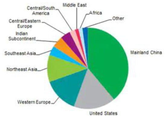 The world’s activated carbon market volume increased from 2015 (2.7 million metric tons), 2017 (3.4 million metric tons), 2019 (4.3 million metric tons) to 2021 (5.4 million metric tons) due to the environmental regulations []. Activated carbon has been used in water treatment (38%), air purification (24%), and food processing (19%). China accounted for the world′s largest consumption [] of activated carbon in 2020, followed by the United States and Western Europe (Figure 8). Currently, the major activated carbon manufacturers globally include Jacobi Carbons Groups located in Kalmar, Sweden (coconut shell), Kuraray Co. Ltd. Located in Tokyo, Japan (coal and coconut shell), Haycarb (Pvt) Ltd. Located in Chennai, India (coconut shell), General Carbon Corp located in New Jersey, United States (wood, coal, coconut shell), and Cabot Norit located in Amersfoort, The Netherlands and Texas, United States (wood, peat, coconut shell).