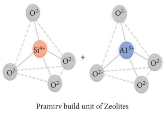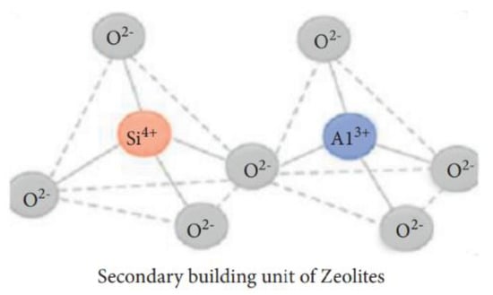 Zeolite has been used in gas adsorption [], water treatment, soil amendment, construction, agriculture, petroleum refining, detergent builders, catalysts, and animal feed additives. Zeolite is produced from alumina (Al) and silica () via the interlinkage of oxygen atoms []. The primary (consisting of the central atom and terminal oxygen) and secondary building blocks (bridging via oxygen–oxygen atoms) can be observed (Figure 9) in zeolites []. Generally, zeolite can be classified into natural zeolites (volcanic and sedimentary rocks) and synthetic zeolites, which account for 37% and 63% of the total zeolite consumption, respectively. Currently, China is the largest producer (of natural zeolite) in the world, followed by South Korea and Slovakia.