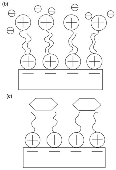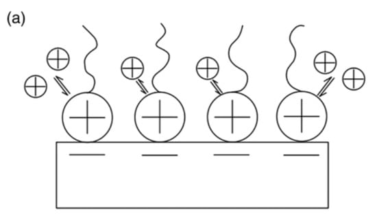 The surfactant-modified zeolite [] was created by mixing a cationic surfactant with natural zeolite (Figure 10). The negative charge (zeolite surface) could adsorb surfactant cations through electrostatic force when the concentration of surfactant was equal to or smaller than the critical micelle concentration. However, the alkyl chain of the surfactant was attracted via hydrophobic interaction when the concentration of the surfactant exceeded the critical micelle concentration. Eventually, a positive charge was produced on the zeolite to remove anionic contaminants.