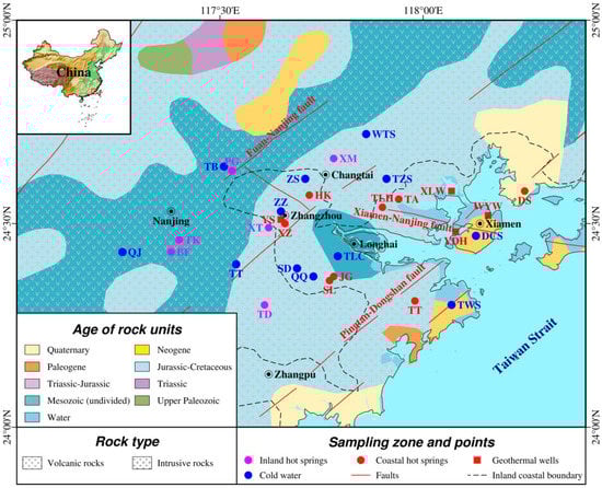 The Xiamen island–Zhangzhou city area is located at the front of the Pacific Rim geotectonic activity zone []. Since the Mesozoic Yanshanian period movement, many periods of intense magmatic activities and tectonic movements have occurred in the area, and the geological formations in the area are diverse and complex [,]. The hot springs in the study area all belong to the low-medium temperature convective hydrothermal systems []. The north-east and north-west fractures constitute the main tectonic framework in this area, and these different fractures, together, form a complete thermal control tectonic system which controls the underground hot water distribution and exposure in the area [,,]. Spatially, hot springs in the area are mainly distributed on the north-west side of the north-east-oriented Pingtan–Dongshan Fault and the south-east side of the Zhenghe–Nanjing Fault Zone. Generally, the zoning boundary of hot springs is comparable to that of large tectonic lines, and the outcrops of hot springs are not directly related to large tectonic structures—the primary fracture—but are more closely related to the next level of fracture structures []. However, from the analysis of individual hot springs, they are mainly exposed at the intersection of the NE- and NW-oriented tectonics. The NW-oriented tectonics in the work area are the newest tectonics in the region, with relatively good underground connectivity and water-richness, providing the main source of recharge and runoff channels for underground hot water, indicating that NW-oriented tectonics are the main water-controlling tectonics in the area. On the other hand, NE-oriented fractures are heat-controlling tectonics [,]. In terms of the topography and stratigraphic lithology of the hot springs, most of the hot water in the area is naturally exposed, mainly in the Quaternary alluvial and alluvial marine deposits, except in Xiamen and Zhangzhou city. In contrast, hot springs in volcanic and sedimentary rocks have intrusive rock outcrops in their vicinity [,]. Figure 1 shows the study area’s location and the hot springs’ distribution.