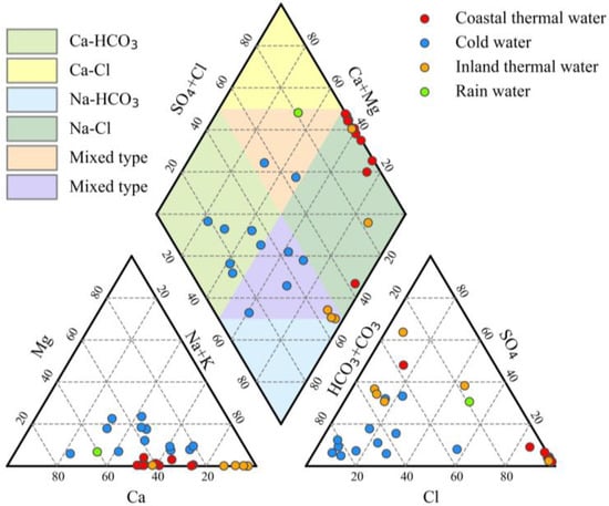 The characteristics of the hydrochemical distribution of geothermal fluids mainly depend on the composition of the surrounding rock and the geological environment during the geothermal fluid circulation [,,]. The groundwater temperature plays a significant role in the dissolution and filtration of geothermal fluids on the surrounding rocks. The total dissolved solids (TDS) and the aggregation of some elements in geothermal fluids increase with the temperature increase. In addition, geothermal fluids often form different types of groundwater by mixing with the groundwater of another genesis during their participation in the natural water cycle. According to the geological environment of the study area, the geothermal system of the study area can be divided into two subzones, the coastal zone and the inland zone, which are used to analyze their different geothermal fluid chemical characteristics. There are 12 geothermal sites in the coastal zone of the study area. Due to the dissolution of residual salts in the marine sediments or the sequestered ancient seawater or the mixing of part of the seawater recharge through the fractures connected with seawater, the total dissolved solids (TDS) of the geothermal fluid in the area is high, ranging from 2.5 to 20.85 g/L, which is brackish-saline water. The anions in the fluid are mainly Cl−, the cations are mainly Na+ and Ca2+, and the water quality types include Cl-Na-Ca, Cl-Ca-Na, and Cl-Na. There are six hot springs in the inland area, mainly located in mountainous basins, depressions, and river valleys in the hilly mountainous region. The geothermal fluid is mainly recharged by atmospheric precipitation and eventually emerges to the surface after deep circulation through fractures. The chemical water components in the geothermal fluid in this area mainly come from the dissolution and filtration of the geothermal fluid on the surrounding rocks, the water cycle alternates slowly, and the total dissolved solids (TDS) is low, ranging from 0.31 to 0.63 g/L, all of which are freshwater. The water quality type is closely related to the composition of the surrounding rocks and water temperature. The anion is mainly HCO3−, SO42-, and the cation is Na+, Ca2+. The water quality type is diverse, mainly including HCO3-Na, HCO3-Ca, and HCO3-SO4-Na -Ca, SO4-Cl -Na (Figure 2).