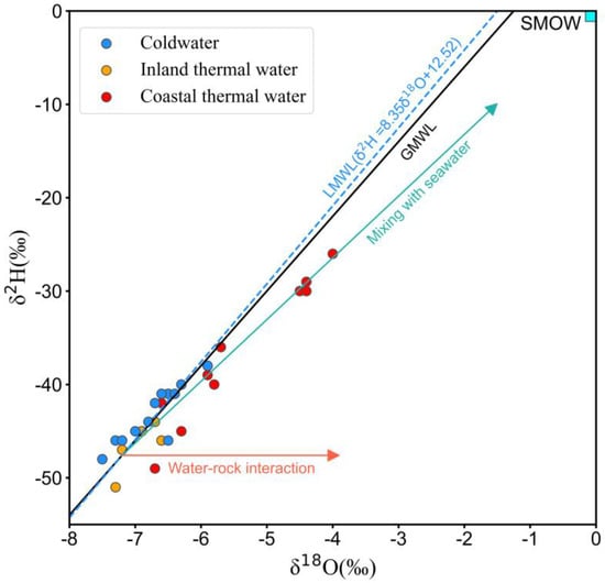 The δ2H ranges of cold springs and groundwater wells are −48‰~−38‰ and −45‰~−40‰, respectively, and the δ18O ranges are −7.5‰~−5.9‰ and −7‰~−6.3‰, respectively. The groundwater wells in the study area are generally shallow. Both the groundwater and cold springs receive direct recharge from precipitation, so their stable isotope components do not differ much, and they are all located near the GMWL [] and LMWL [] (Figure 3). The isotopic values of the thermal water samples also show a limited range of variability: −51‰ to −44‰ and −7.5‰ to −6.5‰ for the inland hot water and −49‰ to −26‰ and −6.7‰ to −4‰ for the coastal hot water, respectively. The hot water is distributed near the GMWL and LMWL, indicating that the hot water receives recharge from local precipitation. No significant oxygen drift in hot water indicates that the geothermal reservoir is not high in temperature and maybe indicates a medium-low temperature geothermal system. The seawater mixing line in the study area can be mapped based on the intersection of GMWL and LMWL and the isotopic composition of seawater (δ2Hseawater = 0, δ18Oseawater = 0) (Pang et al., 2017). More than half of the coastal hot water sites fall on or near this line, indicating that the geothermal fluids are influenced by seawater mixing, which is also entirely consistent with the anomalously high Cl− content in the coastal hot water (Table 1).