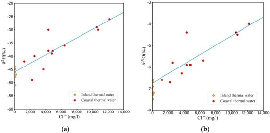 Cl−-δ2H (a), Cl−-δ18O (b); correlation of geothermal water in southeastern China.
