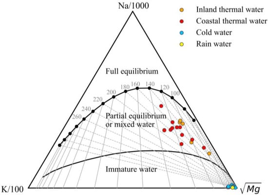 The Na-K-Mg triangle diagram, proposed by Giggenbach [], is divided into three regions: complete equilibrium, partial equilibrium, and immature water, and it is often used to evaluate the state of the water–rock equilibrium and to distinguish different types of water samples. The advantage of this method is that the equilibrium state of a large number of water samples can be judged simultaneously on the same diagram, and the mixed water and equilibrium water can be well separated. The Na, K, and Mg contents of various water bodies in the study area were linearly transformed and projected onto the Na-K-Mg equilibrium triangle (Figure 5), in which all shallow groundwater and cold springs were located in the immature water region at the right lower apex of Mg ions, indicating that they were still in the primary stage of water–rock interaction, while all samples of hot springs and geothermal wells were in the partial equilibrium or mixed water region, reflecting that the ionic equilibrium between the water and rock has not yet been reached, and dissolution is still ongoing, or the hot water was mixed with cold water. In addition, the geothermal reservoir temperatures of most of the hot springs in the Na-K-Mg equilibrium triangle diagram fall between 120 °C and 160 °C. The geothermal reservoir temperatures of the Tangan hot spring all fall between 160 °C and 180 °C, and the geothermal reservoir temperatures of hot water from the Huangkeng hot spring, Henglinwan geothermal well, and Yuanshan geothermal well all fall between 180 °C and 200 °C.