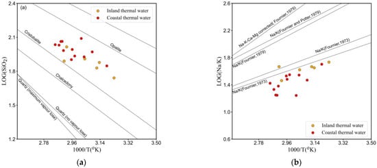 From Figure 6a, it can be seen that most of the hot water sample points in the study area fall between the theoretical equilibrium dissolution line of Cristobalite and Opalite, indicating that the samples are saturated or supersaturated with quartz and chalcedony. In addition, most of the sample points in the study area fall below the Na/K equilibrium line. Only the water samples from the Tangkeng hot spring are located between the Na/K equilibrium line [] and the Na/K equilibrium line [] (Figure 6b), indicating that most of the water samples may be influenced by cold water mixing. The water–rock interaction has not reached full equilibrium.