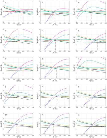 The SI-T curves for all hot water samples in the study area are shown in Figure 7. As can be seen in Figure 7, the dissolution curves of minerals in most of the hot spring samples are well converged, except for the poorly converged dissolution curves of different minerals in the Tangkeng (Figure 7d) and Pangu (Figure 7i) hot spring samples. The corresponding horizontal coordinate is the geothermal reservoir temperature of this geothermal system. The geothermal reservoir temperatures of most of the geothermal systems in the study area range from 125 to 160 °C, which is in general agreement with the results of the SiO2 geothermometer (without vapor loss) (Table 2).