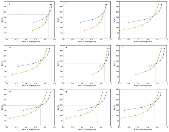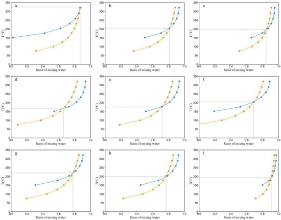 Graphical representation of the ratio of deep hot water temperature to mixed cold water in the study area ((a)—Huangkeng; (b)—Tangdou; (c)—Xintang; (d)—Tangkeng; (e)—Xiazhuang; (f)—Songling; (g)—Jingu; (h)—Tangtou; (i)—Pangu; (j)—Xuemei; (k)—Tianli; (l)—Tangan; (m)—Baofen; (n)—Yuandanhu; (o)—Wuyuanwan; (p)—Xinlinwan; (q)—Dongshan; (r)—Yuanshan).