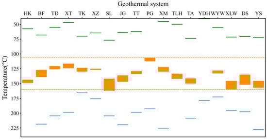 Geothermal reservoir temperatures of different geothermal systems in the study area obtained by different methods. The orange bar graph shows the range of geothermal reservoir temperatures determined by the quartz geothermometer (without vapor loss) and the multiple mineral saturation index method; the blue line indicates the geothermal reservoir temperature obtained from the silica-enthalpy mixing model, and the green line shows the hot water temperature at the surface of the corresponding geothermal system.