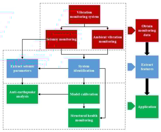Figure 1 shows the flowchart of the application of the vibration monitoring data of concrete dams. As shown in Figure 1, in order to realize the model calibration [15], the anti-earthquake analyses and structural health diagnoses [16,17] of concrete dams, through seismic monitoring, and the dynamic structural parameters, such as the modal parameters of concrete dams, need to be identified first. Modal identification methods are diverse, and many identification methods are being updated. Different system identification methods will produce different system identification results, which complicate the subsequent application of the system identification results of concrete dams. For practical engineering problems, further investigations are required to identify how to select the appropriate method to obtain the system identification results that reflect the actual dynamic characteristics of concrete dams through seismic monitoring data.