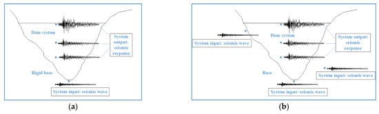 The input–output system of a concrete dam: (a) uniform support excitation; (b) non-uniform multiple-support excitation.
