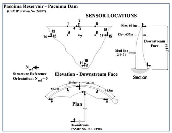 Pacoima arch dam and the layout of the acceleration sensors (http://www.strongmotioncenter.org/NCESMD/photos/CGS/lllayouts/ll24207.gif ) (accessed on 1 July 2021).