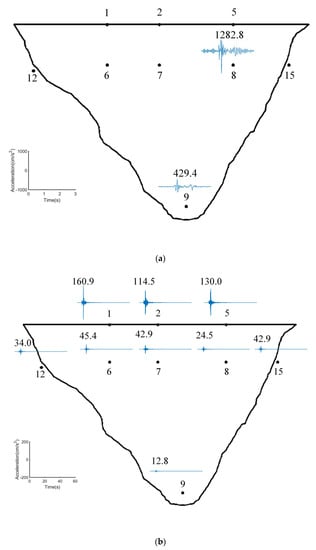 This area has experienced several earthquakes of different magnitudes, as shown in Table 2. Amongst them, the San Fernando earthquake on 9 February 1971 and the Northridge earthquake on 17 January 1994 were the strongest. During the San Fernando earthquake in 1971, the horizontal acceleration recorded by the accelerometer, which was installed on the left abutment 15 m above the dam top, was 1.25 g, and the peak value of the vertical acceleration was 0.7 g. A 6.35–9.7 mm crack with a depth of 13.7 m appeared between the dam and the left bank of the gravity pier. Due to the severe damage that was afflicted during the San Fernando earthquake in 1971, the dam was repaired by installing 35 steel tension cables to stabilize the upper-left abutment rock in 1976. In 1977, the dam body, foundation, and abutment of the Pacoima arch dam were assigned 9 acceleration sensors and 17 observation channels, as shown in Figure 3. Observation channels 1–8 were located on the dam body, 9–11 were located on the base rock, and 12–17 were on the right and left shoulders, which were at 80% of the dam height (elevation 637 m). The measurement direction of channels 1, 2, 5, 6, 7, 8, 9, 12, and 15 was in the radial direction, and channels 4, 11, 14, and 17 were in the tangential direction, while channels 3, 10, 13, and 16 were in the vertical direction. The structural damage caused by the Northridge earthquake on 17 January 1994 was more severe than that in the San Fernando earthquake in 1971. This earthquake caused a 50 cm downstream sliding of the thrust pier, and the horizontal opening of the expansion seam near the top of the dam was up to 5 cm. Serious cracks occurred on the left abutment of the dam [41], but no noticeable damage was found on the right abutment. After that, the dam was repaired specifically to strengthen the rocks on the left abutment. Most of the 17 channels for observing a strong earthquake at the dam could not record data due to the large seismic amplitude and high frequency. Only channels 1~3 and channels 8~11 recorded data, and the observed strong-motion sampling frequency was fs = 50 Hz.