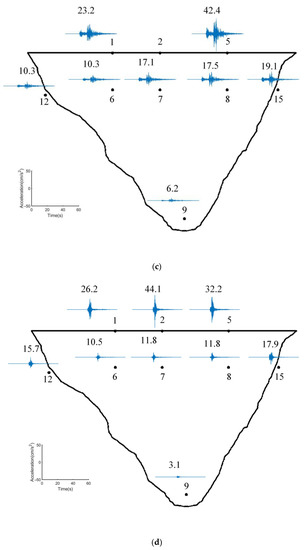 Earthquake responses of observation channels 1, 2, 5, 6, 7, 8, 9, 12, and 15 in the radial direction: (a) 1994 Northridge; (b) 2001 San Fernando; (c) 2008 Chino Hills; (d) 2011 Newhall.