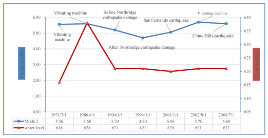 The natural frequency and damping ratio of the Pacoima Dam, identified by some researchers, are shown in Table 3. Figure 5 shows the change in the second-order natural frequency of the dam over time. The following points can be derived from Table 3 and Figure 5.