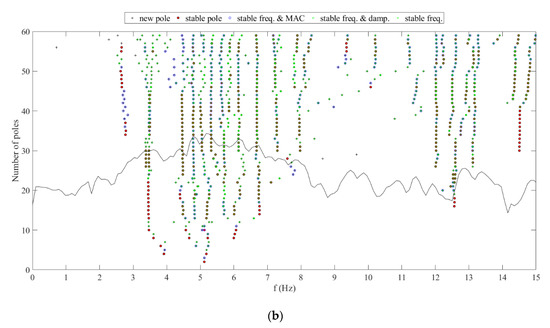 Stabilization diagram corresponding to different methods of modal identification in the San Fernando earthquake in 2001: (a) ERA-OKID-OO method; (b) N4SID-OO method.