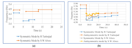 Time-variant frequency identification results of seismic records obtained by Tarinejad and Alves: (a) 1994 Northridge earthquake; (b) 2001 San Fernando earthquake.