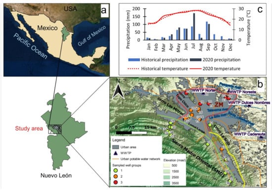 (a) Location of the state of Nuevo León in Northern Mexico and the study area, Monterrey Metropolitan Area (MMA); (b) location of the sampled wells with well numbers. The different colors indicate well groups identified using the clustering method described in the main text: green indicates recharge zone samples, orange indicates transition zone samples, and red indicates discharge zone samples; (c) historical (1951–2020) and 2020 accumulated monthly precipitation and mean monthly temperature in the MMA (source: http://clicom-mex.cicese.mx/ (accessed on 12 March 2022)).