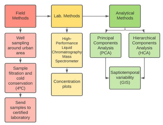 Two sampling campaigns were carried out in 2020, considering water supply wells for the MMA. Five wells located in the ZM aquifer were initially monitored from 15th to 16th March 2020, as an approach for surveying Asws occurrence in the area. The second field campaign considered samples from 42 sites from the ZM (27) (including the previous 5 from initial field campaign), BA (8), and SA (7) aquifer units and took place from October 29th to November 6th, 2020 (Figure 1c). The five wells from the first campaign were resampled. A summary of the applied methods is shown in a schematic flow diagram (Figure 2). All surveyed wells form part of the well network of the Monterrey’s water and sanitation utility and are equipped with pre-installed pumps and hydraulic equipment pertinent to the operation. Field parameters, i.e., pH, temperature, electrical conductivity (EC), oxidation–reduction potential (ORP), dissolved oxygen (DO), and total dissolved solids (TDSs), were measured on-site using pre-calibrated electrodes (YSI® Professional Plus, OH, USA). Samples were collected in sterile pre-rinsed polyethylene bottles and then stored in an icebox until filtration. All water samples were filtered through 0.45 µm pore-size cellulose nitrate membrane filters using a vacuum medium and placed in HDPE bottles on the same sampling day. Alkalinity was measured via the titration method using HCl 0.1 M as the titrant until a pH value of 4.3 was reached. Samples for cation analysis were stored after filtration in 250 mL HDPE bottles and preserved with ultra-pure HNO3 at pH < 2 to avoid element precipitation/adsorption during storage. Samples for anion analysis and artificial sweeteners were placed and stored in HDPE bottles with capacities of 250 and 125 mL, respectively.