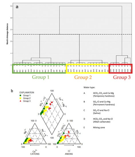 (a) Resulting dendrogram of the HCA applied to the MMA groundwater dataset. A phenom line (dashed line) is used to identify the three groups. (b) Trilinear diagram showing the different water types in the MMA groundwater.
