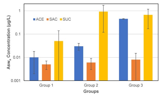 A second interpretation regarding the decreasing concentrations of Asws between groups 2 and 3 within the same sampling period is that SUC (the most abundant Asws in the groundwater of groups 2 and 3) underwent biodegradation processes with the septic sludge within the drainage network. Other studies reported that a slow reduction in SUC concentrations is consistent with the slow and incomplete mineralization of SUC in sewage under aerobic conditions []. Thus, decreasing concentrations of SUC in groundwater might be caused by biodegradation prior to or during percolation [].