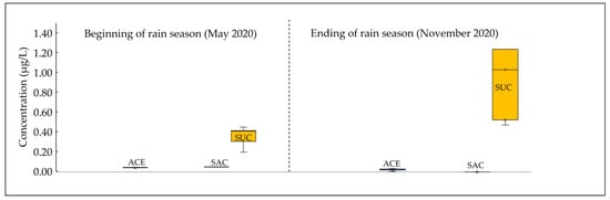 The seasonal variation in concentrations of Asws in the groundwater samples of group 2 is shown in Figure 5. To assess the Asws changes over time, the Kruskal–Wallis test was applied between the samples collected in May 2020 (beginning of the wet season) and samples collected in November 2020 (end of the wet season). Five samples from the transitional water group (group 2) were compared between the two temporal datasets. The test evaluated whether Asws concentrations have significant differences (p < 0.05) between climatic seasons (Table S3, Supplementary Materials). The results show that dominant Asws concentrations at the start of the rainy season (May 2020) were in the order of SUC (mean of 1.18 µg/L) > ACE (mean of 0.19 µg/L). However, at the end of the wet season (November 2020), mean concentration values for ACE slightly decreased (0.11 µg/L; no significant temporal differences were found), whereas SUC mean concentrations were significantly higher (p < 0.05) than those retrieved at the beginning of the wet season. As described above, the year 2020 is considered a rather dry year because the mean monthly precipitation was reported to be below the historical average. However, soil saturation during July from the intense rain events caused by tropical storm Hanna may have been an important contribution to the mobility of Asws along the MMA aquifer (Figure 1). This trend could be confirmed through a monitoring scheme of the MMA wells over time. However, a possible interpretation of these increases in concentrations is that four out of five of the sampled wells are near hospital facilities, malls, and industrial manufacturers located at lower gradients near the Santa Catarina River, which are areas that typically receive wastewater discharge carrying oil residues, soaps and detergents, paints, and septic waste []. The remaining well is in a transited urban area with small business and commercial activities. Inherent to the location, another possible interpretation for the Asws concentration variation could be the occurrence of the coldest periods. The warmer ambient temperatures recorded during May 2020 (26.6 °C) in comparison with the lower temperature values during November (Figure 1) might play a key role in degrading SUC in aqueous media at the beginning of the rainy season []. Correspondingly, the mobilization of SUC from the unsaturated zone to the aquifer due to high rainfall rates and colder temperatures (in the order of 15 °C) at the end of the rainy season may concentrate SUC in the groundwater, leading to higher SUC concentrations.