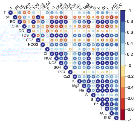 Processes that regulate groundwater compositions and solute origins can be determined from compositional relationships between the dissolved compounds []. Each parameter was checked for normality using the Shapiro–Wilk test (Table S2, Supplementary Materials). In all cases except for temperature, values of this test were equal to or less than 0.05, which indicates that all measured groundwater parameters except temperature were non-normally distributed. As a result, the non-parametric Spearman rank correlation method was employed to measure correlations between variables (Figure 6). Consequently, EC correlated with TDS, having Na+, Cl−, and SO42− as the main constituents. Similarly, NO3−, I−, B, Br−, HCO3−, K+, Ca2+, Mg2+, ACE, and SUC were highly correlated with TDS. It is evident that groundwater salinity is supplied by these major elements.