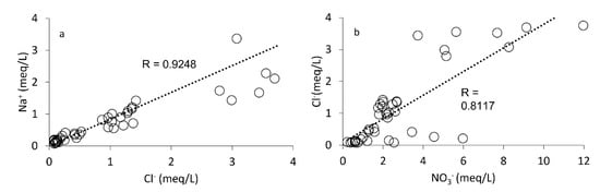 (a) Plots of Na+ vs. Cl−, and (b) Cl− vs. NO3−.