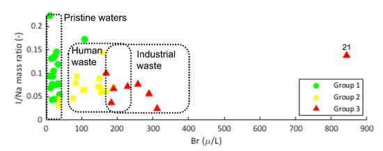 Figure 8 illustrates three classifications based on the I/Na mass ratio vs. Br−, indicating pristine waters (group 1), urban-affected water (group 2), and a mixture of water affected by urban wastewater and wastewater derived from the food industry (group 3). High concentrations of I− have been identified in contaminated shallow groundwater derived from landfill leachates, medical products, and animal additives [,]; therefore, the plot of I/Na ratios vs. Br− concentrations is useful for elucidating contamination sources in groundwater resources. Increases in Br− concentrations can be observed between groups, creating an overlay between groups 2 and 3. Overall, although the groundwater of group 2 strongly interacts with carbonates, silicates, and evaporitic rocks, it has a wastewater influence as it flows through a heavily populated business district in the urban area [,]. Similarly, the groundwater of group 3 falls in the range of water strongly affected by urban and industrial wastewater, which seems consistent with the well locations in the northwestern MMA, where there is an important industrial sector.