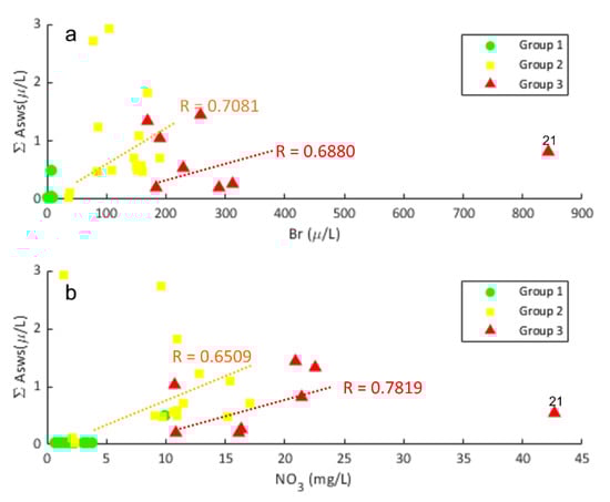 (a) Linear regression between ƩAsw3 and Br concentrations, and (b) between ƩAsws and NO3− concentrations.
