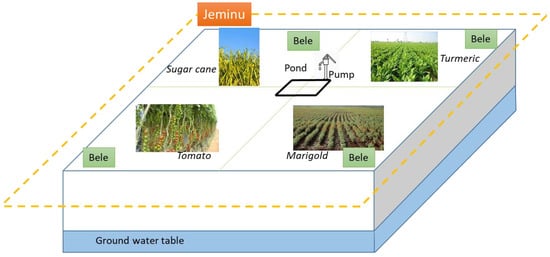 The dramatic development of groundwater irrigation in the recent decades in India has increased the irrigated area, simultaneously increasing food production to sustain the demand of a growing population. However, this came at the cost of tremendous impacts on energy consumption [], resource depletion [] and pollution [,], which now calls for an urgent rationalization of groundwater use. However, solutions are not straightforward, and recent detailed studies conducted in a groundwater-irrigated region in southern India, belonging to the Kabini Critical Zone Observatory in Karnataka ([]; SNO M-tropics, https://mtropics.obs-mip.fr/, accessed on 11 October 2022) have illustrated the complex interactions and feedback between water resource availability and cropping systems, documenting the complex technical functioning of a diversity of farming systems [,]. Most Indian farmers are smallholders (less than 1ha on average), and their land is composed of one or several independent pieces of land, called “jeminu”, in Karnataka. The size of a jeminu can vary greatly (from 0.1 to several hectares), but typically are about half a hectare, which can be divided into several plots for growing different crops in rotation. When jeminus are irrigated, they share the same water sources: a borewell and/or, more rarely, a farm pond. In hard rock aquifers, pump yields are small and often insufficient to fully satisfy the needs of water-intensive crops on large surfaces [], and they vary in time with water table level as hydraulic conductivity decreases sharply with depth [,]. In addition, the energy required to operate submersible pumps is provided by the government at no cost but for a limited number of hours per day. Therefore, irrigated cropping systems are still largely dependent on rainfall, and farmers need to elaborate complex strategies involving the combination of different crops in the same jeminu, and allocate the adequate irrigation water to each of them to optimize their crop yield and economic returns. The system can become even more complex, as farm ponds, encouraged by local governments for securing alternate sources of irrigation and/or for enhancing the aquifer recharge [], are increasingly present, adding further complexity to the system. Model-based decision support systems can therefore be of great help to farmers and decision makers in assessing a range of irrigation strategies.