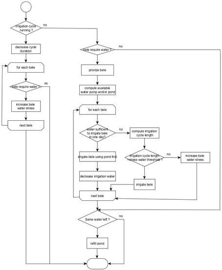 Competition between the irrigation required by each bele and the availability of water for the jeminu is managed in the irrigation model at the jeminu level. This is an adaptation of the algorithm developed in []. The general principles are as follows (Figure 2):