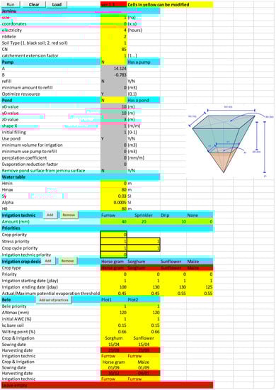 Simulating decisions on the farm and the technical operations of the system is a good way to test management practices, as it integrates the dynamics of resource sharing and constraints of the farm depending on the weather and the crop’s phenological stage []. Linking soil-crop models and decision-making models is an appropriate approach for analyzing the adaptation of practices to face new agricultural challenges, such as climate change []. However, in order to use modelling and simulation as a tool to provide new insights on the impacts of different water policies on farmers and on groundwater resources, there is a need for simple models which can be utilized to assess scenarios with policy-makers, extensionists and farmers []. However, given the large diversity of farming systems in the world, there is no “one fits all” model which could adequately represent all types of agriculture. In particular, few models can represent smallholding farms, which account for a large proportion of agriculture in Africa and South Asia, and especially in India []. Such a model needs to be parsimonious [], integrate farmers’ decision-making on crops and crop management [], allow integrating rainfed crops and represent the effect of conjunctive use of surface water and groundwater on the resource and different irrigation techniques [].