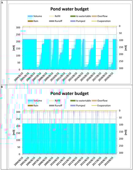 Pond water budget for Sc1 (A) and Sc3 (B).