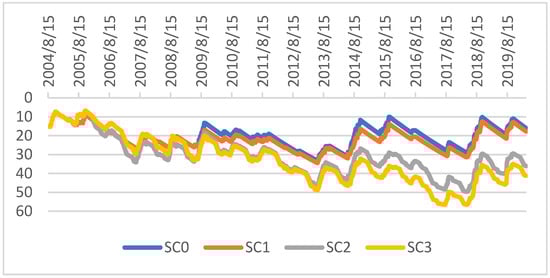 The last indicator we propose is water table evolution due to the use of the different systems (Figure 6). The use of the pond in Sc1 has a low impact on the water table (comparing Sc0 and Sc1). The slight decrease in water table levels in Sc1 comes from the reduction of crop failures, which consequently reduces the water that is drained into the groundwater, as it is used by the saved crops. The 100% irrigated cropping system of Sc2 impacts the level of the water table, because the long-term pumping pushes the water table to a quasi-constant decline. On the other hand, in Sc3, and in addition to the phenomenon explained before (the reduction of crop failure), the amount of water pumped is important because all the water available from the pump for one day is pumped even if there is no irrigation demand or if the irrigation demand is lower than the water available from the pump.