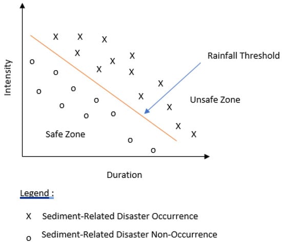 While the empirical model is more widespread, the application of empirical rainfall thresholds has been in place since 1987, with many studies conducted in many countries, especially in Italy, and central and southern Europe []. There are several types and characteristics of rainfall thresholds, namely the intensity–duration (I-D), accumulated rainfall–duration (E-D), intensity–accumulated rainfall (I-E), accumulated rainfall–accumulated rainfall (E-E) and antecedent or working rainfall or rainfall index. The most common and pioneering is the I-D threshold established by Caine [] Most of the threshold correlating the rainfall characteristic to landslide events is presented in terms of the power law relationship []. The main goal in the empirical model development is to identify the rain that has triggered the disaster despite other additional factors, if present. Therefore, the definition of rainfall intensity plays the most crucial part in this manner []. Rainfall intensity refers to the rainfall depth over a certain duration, depending on the observation period. The timescale is normally in an hourly format []. For a short period, it may represent the current intensity of the rainfall during the occurrence of the disaster. Likewise, for a long period, it may represent the average value of the rainfall over hours, i.e., 2, 3 or 24 h. The definition should be consistent during the construction of the numerical rainfall characteristic of the historical events, and the forecasting rainfall (forecasting events) and the observed rainfall (monitoring events). Due to the diversity of the definition, one should state clearly the definition of rainfall intensity in their work for others to compare and adopt the method accordingly. The disaster is likely to occur when the current rainfall characteristic based on the observed rainfall data (or real-time data) are beyond the rainfall characteristic that resulted in the disaster in the past, referred to as the rainfall threshold. The framework is adopted in the early warning system as a warning model that the impending disaster can be forecasted, in order to alert the respective stakeholder (authority or community). Figure 2 illustrates the conceptual description of the I-D threshold under ideal conditions, where there is a clear separation between the sediment-related disaster-triggering and non-triggering rainfall conditions [].