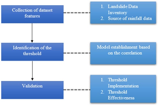 Both the physical and empirical model are significant and can be used as warning models employed in any early warning system in order to reduce the disaster risk. However, the chosen model should be tailored according to the local environment, climate and geological condition of the area under surveillance. Since sediment-related disaster is caused by many factors—either spatial or climatic factors and types of behavior—it is pertinent to compile all of the important information related to the possible causes []. In general, the process or step of the threshold development is illustrated in the figure below.