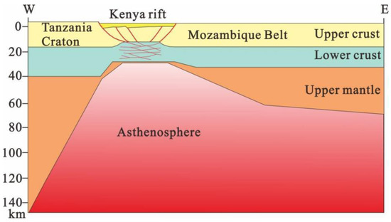 Composite lithospheric E-W cross-section of the Kenya rift, modified from Hetzel et al. [7]. The sub-horizontal thin red lines represent the anastomosing shear zones in the lower crust.