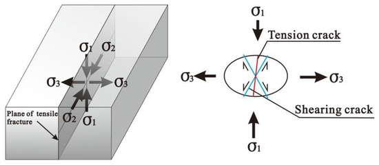 Two types of methods are mainly used to analyze tectonic stress in relation to the formation of ground fissures in a rift valley. The first is the analysis of the geometric relationship between the principal stress direction and the strikes of ground fissures. Tensile fractures usually develop perpendicular to the direction of the minimum principal stress (σ3) or parallel to the direction of the maximum principal stress (σ1) (Figure 3) [16]. According to the direction of the principal stress in the rift area, the theoretical direction of the development of tensile fractures in the rift area can be analyzed. The relationship between regional tectonic stress and tension fractures can be established by comparing the development direction of actual tension fractures and the theoretical development direction of tension fractures in the rift valley.