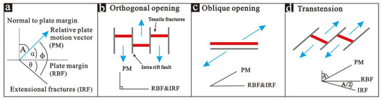 The second is the analysis of the geometric relationship between the direction of plate movement and the strike of the ground fissures. Tuckwell (1996) proposed that in a rift, there is a specific corresponding relationship between the angle of the plate motion vector, plate edge direction, and fault direction [17] (Figure 4). The formation of extensional tectonic fractures in rift valleys is not only related to regional tensile stress, but also to the direction of plate movement. According to the mode of fracture opening, extensional structures in rifts can be divided into three opening types: orthogonal, oblique, and transtensional (Figure 4). According to the opening model of an extensional fault in a rift region, the development direction of a tensile fracture under the joint action of a pre-existing fault and the plate tension in the rift can be obtained.