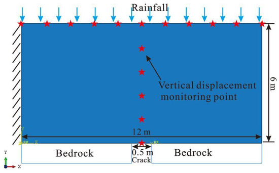 In the numerical model, we limited the horizontal and vertical displacements of the left and right boundaries of the soil and bedrock, while the upper and lower boundaries of the soil could be freely displaced and deformed. The upper surface of the soil represented the infiltration surface of seepage, and the lower surface of the soil represented the outlet of seepage. The bedrock surface acted as an impermeable surface. The stress state of the initial model before the solution satisfied the initial stress equilibrium condition, in that the in situ stress increased linearly with depth, and the initial displacement was zero. We set vertical displacement monitoring points on the surface of the calculation model and on the upper part of the hidden crack in order to monitor the deformation characteristics of the soil at different distances and depths from the hidden crack (Figure 5).