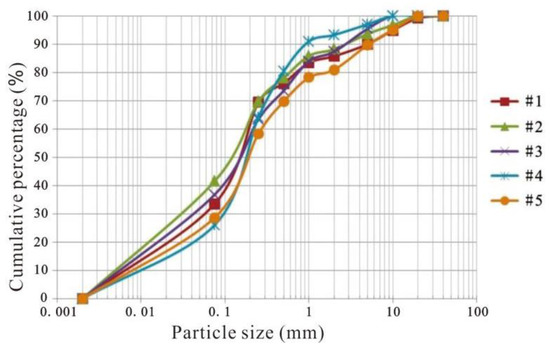We sampled the soil at depths of 0.5, 2.5, 3.5, 4.5, and 6 m near the surface of the study area, and conducted indoor geotechnical tests. The results are shown in Table 2, and the grain size distribution curves are shown in Figure 6. The unified soil classification system (USCS) was used to classify the soil type; it was classified as silty sand (SM) according to the particle size distribution. The soil was found to be mixed with porous and light pumice particles formed by volcanic eruptions. Pumice is less dense than water due to its highly porous nature, and it is responsible for the low density and large void ratios of the analyzed soil.