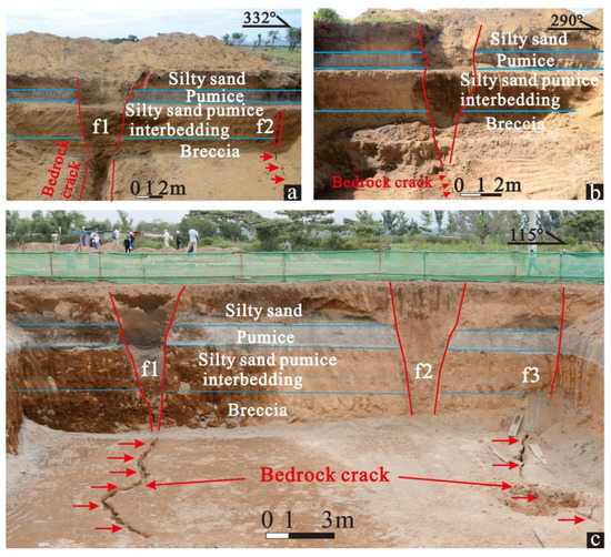 Exploratory Trench 1 was excavated to a depth of 6 m to reach the volcanic rock. After cleaning the bedrock surface, previously hidden bedrock cracks were clearly observed. The bedrock cracks and the area above the bedrock surface of f1 were filled with silty sand, whereas f2 remained open and unfilled (Figure 10d,e). Morphological observations of the f2 bedrock crack showed that the side wall of the crack was vertical and rough, but there were no obvious horizontal or vertical dislocations on either side; these are characteristics of obvious tensile cracking (Figure 10f). The widths of the f1 and f2 cracks were approximately 150 cm and 4–10 cm, respectively, and their strikes were 17° and 35°, respectively; both followed the NNE direction, which is approximately perpendicular to the direction of the minimum horizontal stress in the region.