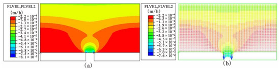 Vertical velocity of seepage. (a) Velocity distribution diagram and (b) velocity vector diagram, where Flvel is the velocity vector of seepage and Flvel2 is the vertical velocity vector of seepage. The seepage rate is in m/h.