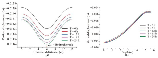 The soil mass of the loose accumulation layer was found to be deformed during continuous rainfall, to a certain extent. Therefore, we constructed a time-varying curve of the vertical displacement of the surface soil (Figure 15a) and a time-varying curve of the vertical displacement of the soil at different depths above the concealed crack (Figure 15b). The locations of the vertical displacement monitoring points in the numerical model are shown in Figure 5. In the presence of hidden cracks, the soil settled vertically under the action of gravity (corresponding to the displacement curve of T = 0 h in Figure 15). The maximum vertical displacement in the upper area of the concealed bedrock crack was approximately 14.3 mm, and there was a small amount of settlement away from the crack. After the onset of rainfall, the settlement of the surface soil was largest at the hidden bedrock crack. On the variation curve of the vertical displacement of the surface soil with time, the distance between adjacent time curves decreased gradually, which indicated that the settlement rate was fast during the initial stage of rainfall and gradually slowed down during the later stages (Figure 15a). This occurred because the soil mass was in an unsaturated state at the initial stage of rainfall, and rainfall then increased the weight of the soil mass, which resulted in its compression. With continuous rainfall, the soil gradually became saturated and the effective stress decreased, so the settlement rate gradually slowed down. The displacement versus time curves at different depths show that the settlement of shallow soil was greater than that of deep soil, because the settlement of shallow soil accumulated the combined settlement of lower soil (Figure 15b).