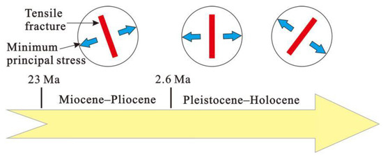 The direction of the minimum principal stress in the Kenya Rift Valley from the Miocene to the Pliocene was ENE-WNW. After the Upper Pleistocene, the minimum principal stress in East Africa rotated clockwise from E-W to NW-SE [20]. At present, the direction of the minimum principal stress in the rift area is NW-SE. According to the mechanical mechanism of tensile fracture development, its strike should be perpendicular to the direction of regional minimum stress. Therefore, the strike of the tension fractures formed between the Miocene and the Pliocene should be NNW. After the Pliocene, the principal stress was deflected clockwise, and the dominant trend of the tension fractures gradually deflected from N-S to NE-SW (Figure 16). According to the mechanical analysis of the tensile fracture and the principal stress direction, the direction of the theoretical tensile cracks in the rift valley area (NW to NE) is consistent with the dominant trend of the current concealed bedrock fractures found in the field. Therefore, the formation of concealed bedrock fractures is controlled by the direction of regional tectonic stress.
