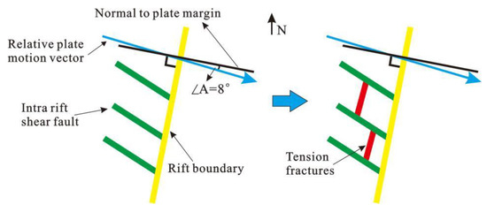 According to the extension fault opening models proposed by Tuckwell (1996) (mentioned in Section 3.2) and based on the rift boundary strike, plate extension direction, and the strikes of pre-existing faults, the dominant development direction of pull-down tension fractures under the combined influence of plate movement and pre-existing faults can be inversed. The strike of the rift boundary in the study area is NNE, the relative motion vector of the plate is SSE, and the strike of the Cambrian basement shear zone is NW (Figure 2). By extracting the geometric elements shown in Figure 2 and considering the angular relationship between the linear elements of the strike-slip extension model, the dominant development trend of the tension fractures in the rift was inverted (Figure 17).