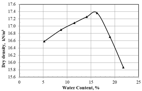 The standard compaction proctor tests were conducted according to ASTM D698 [33]. The compaction curve for the bentonite mixture is presented in Figure 2, and the optimum moisture content and maximum dry density for the Qatif mixture were found to be about 16% and 7.40 kN/m3 respectively.