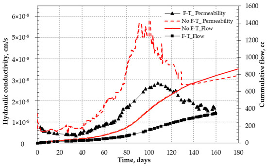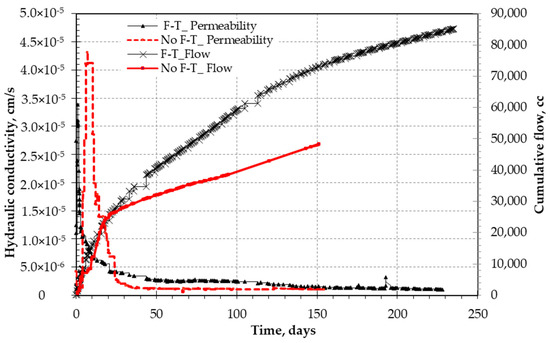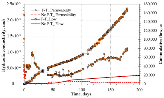 When the vertical applied stress is increased the hydraulic conductivity is decreased as voids will compress. The tunnels or water passways will constrict, thus retarding water flow. The higher stresses can consolidate and cause the clay fabric to change. Comparing Figure 5 and Figure 7 for the 150 days’ measurements, the hydraulic conductivity is increased by more than two orders of magnitude (5 × 10−7 to 0.2 × 10−5). The application of vertical stress of 30 kPa was found to stabilize the constituents of the mixtures and reduce the loss of fines in cases of no F-T action, while the notable drop and repeated waves have been noticed for specimens subjected to multiple F-T cycles.